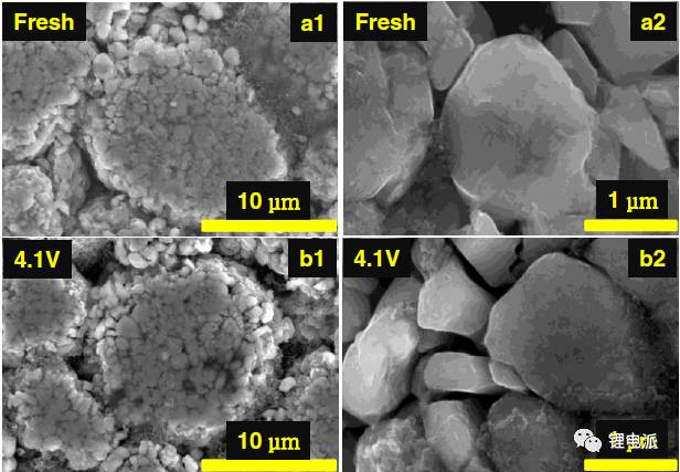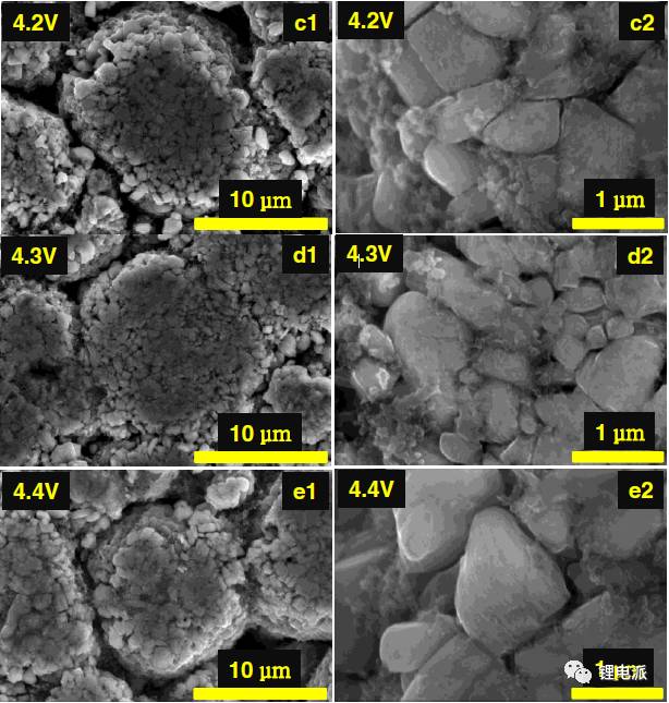 a1 a2为未经过循环的电池SEM图片。b~e分别为在0.5C条件下、充电截止电压为4.1V/4.2V/4.3V/4.4V,循环200cycle后正极活物质的SEM图像,其中左侧为低倍率下,右侧为高倍率下电镜图片。由上图可以看出,循环后的电池与未循环的电池在颗粒形貌、破碎程度上并没有特别大的区别。