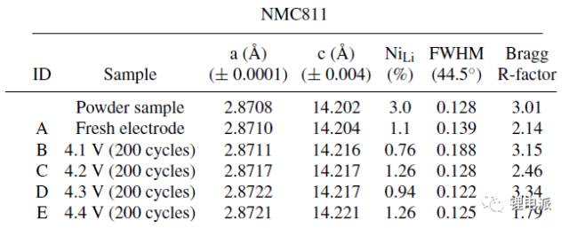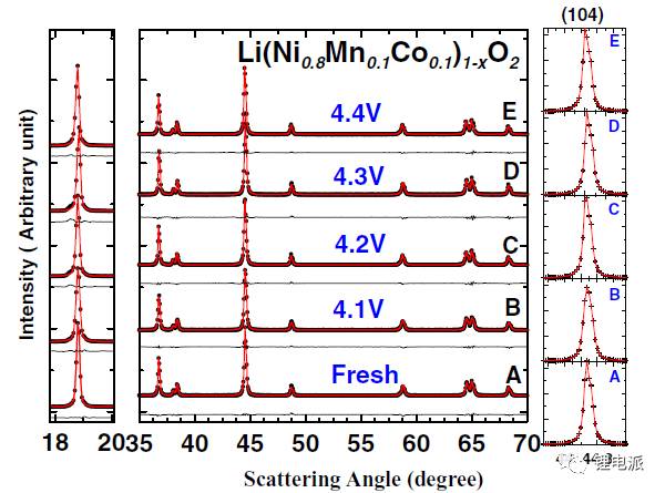 1.未循环的极片晶格常数和NCM811活物质粉末的晶格常数是一致的。循环截止电压是4.1V时,其晶格常数也与前两者无明显区别,c轴有少量增加。再看循环截止电压为4.2V、4.3V、4.4V的c轴晶格常数,与4.1V的无明显区别(差异为0.004埃),而在a轴上的数据就差异比较大了。
