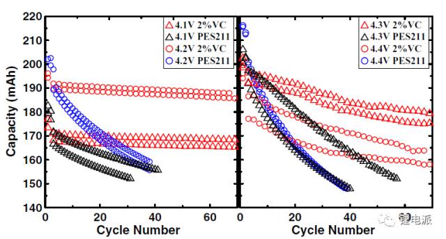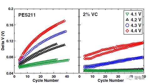 可以看出,在低截止电压下循环,电池△V较小,而电压升高到4.3V以上时,△V急剧升高,电池极化加重,这就大大影响了电池的寿命。从图中也可以看出,VC和PES211的△V变化速率是不同的,这进一步验证了电解液添加剂不同,电池极化程度、速度也是不同的。