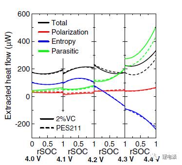 图中显示在4.2V电压之上,寄生热流突然升高,这是因为在高电压下高度脱锂的正极表面极易与电解液发生反应。这也解释了为什么充放电电压越高电池容量维持率下降越快。