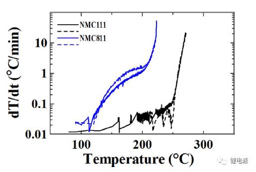 该图是NCM811和NCM111在70℃-350℃之间自加热速率的曲线图。图中显示在105℃左右,NCM811开始发热,而NCM111还没有,一直到200℃时才开始出现了发热。NCM811在从200℃开始,发热速率为1℃/min,而NCM111还是0.05℃/min,这也意味着NCM811/石墨体系的电池较难通过强制安全认证。