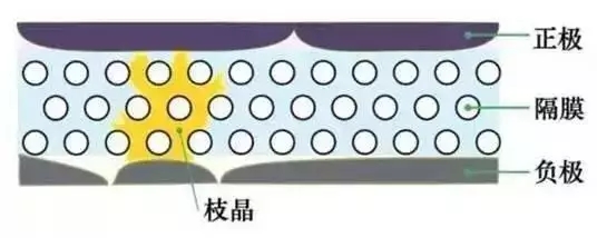 保护措施: 锂电池电芯过充到电压高于4.2V后,会开始产生副作用。过充电压愈高,危险性也跟着愈高。锂电芯电压高于4.2V后,正极材料内剩下的锂原子数量不到一半,此时储存格常会垮掉,让电池容量产生永久性的下降。如果继续充电,由于负极的储存格已经装满了锂原子,后续的锂金属会堆积于负极材料表面。这些锂原子会由负极表面往锂离子来的方向长出树枝状结晶。这些锂金属结晶会穿过隔膜纸,使正负极短路。有时在短路发生前电池就先爆炸,这是因为在过充过程,电解液等材料会裂解产生气体,使得电池外壳或压力阀鼓涨破裂,让氧气进去与堆积在负极表面的锂原子反应,进而爆炸。
