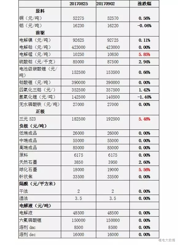 三元材料:在需求方面,市场临近月底,电池企业开始订9月份的货,在上游原材料方面,受近期钴、镍、碳酸锂等原料集体上调的影响,三元材料厂家本周大多暂停报价,纷纷合计9月份的订价方案。8月份一些三元材料厂家因碳酸锂短缺,产量也略有影响。