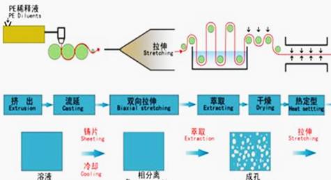 目前,锂离子电池隔膜制备方法主要有湿法和干法。湿法又称相分离法或热致相分离法,将液态烃或小分子物质与聚烯烃树脂混合,加热熔融后,形成均匀的混合物,然后降温进行相分离,压制得膜片,再将膜片加热至接近熔点温度,进行双向拉伸使分子链取向,最后保温一定时间,用易挥发物质洗脱残留的溶剂,制备出相互贯通的微孔膜。干法是将聚烯烃树脂熔融、挤压、吹膜制成结晶性聚合物薄膜,经过结晶化处理、退火后,得到高度取向的多层结构,在高温下进一步拉伸,将结晶面进行剥离,形成多孔结构,可以增加薄膜的孔径。