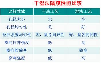 湿法和干法各有优缺点,其中,湿法工艺薄膜孔径小而且均匀,薄膜更薄,但是投资大,工艺复杂,环境污染大;而干法工艺相对简单,附加值高,环境友好,但孔径和孔隙率难以控制,产品难以做薄。