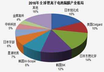全球范围内的锂离子电池隔膜的市场需求量呈逐年递增的趋势,隔膜出货量从2009年的2.4亿平米增至2014年的11.85亿平米。日本旭化成、日本东燃化学以及美国Celgard(Celgard于2015年2月被湿法技术代表公司旭化成收购,干法生产线停产并新建立湿法生产线)是隔膜三巨头,占据的全球市场份额曾高达77%。但随着韩国和中国企业的崛起,三巨头的份额在快速下滑,2014年占比56%左右。