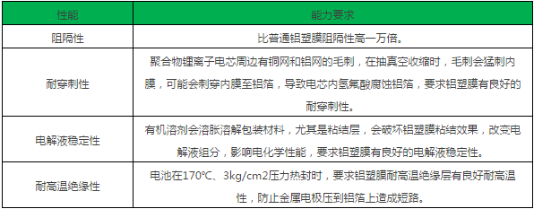 作为软包电池的核心材料,铝塑膜的生产技术难度远高于隔膜、正极、负极、电解液,是锂电池行业内三大高技术之一。从产品性能上看,我国铝塑膜产品与国外产品存在较大差距,主要表现在:铝箔表面处理工艺落后、污染大;铝箔的水处理会产生“氢脆”,导致铝塑膜耐拆度差;铝箔表面挺度不够,良品率差;聚丙烯与高导热的铝箔表面复合时易卷曲,产生层状结晶;国内胶粘剂配方工艺较差,易出现分层剥离问题。