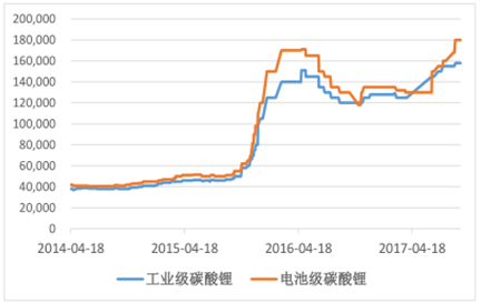 碳酸锂主要应用于陶瓷、玻璃、锂电池等行业,分为电池级和工业级碳酸锂。工业级碳酸锂的需求比较稳定,每年增长为个位数。而电池级碳酸锂占比约为 40%,随着近几年新能源汽车的快速增长,电池级碳酸锂的需求年复合增长可达50%以上,拉动的了碳酸锂的价格和需求的整体上涨。而随着电池级碳酸锂的需求持续增加,国内碳酸锂的供需仍存在缺口,随着盐湖提锂的技术逐步完善,盐湖提锂仍将持续扩产,大部分于新增产能将于 2019年至2020年期间建成到达产,所以预计到 2020年国内碳酸锂供需将实现平衡。