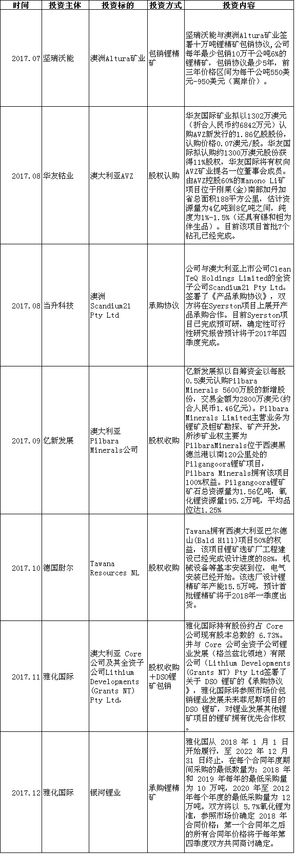 锂电池未来几年增长预期良好,锂盐厂及正极材料厂争相扩产。而国内锂资源释放前景不明,为保障原料需求,国内企业纷纷加紧对海外资源的锁定。记者梳理下半年重要海外锂资源投资事件如下:
