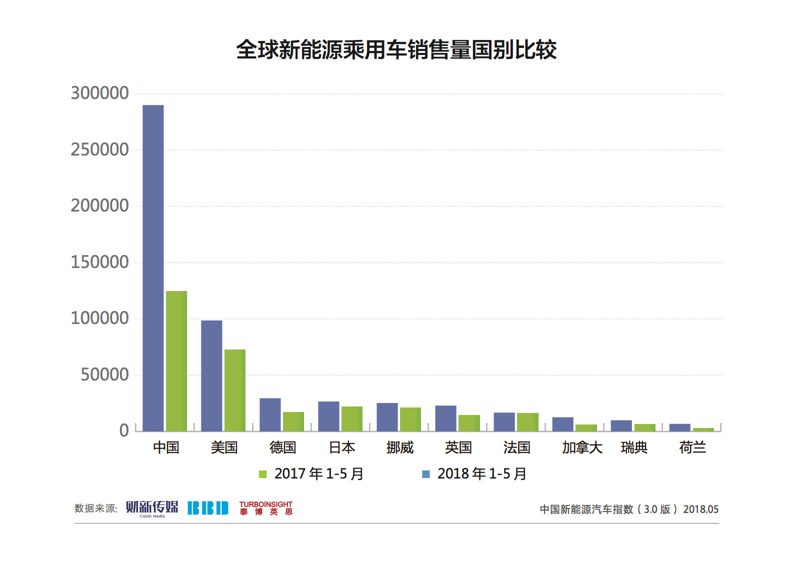 从财新数联的一份报告中可以看出,中国新能源乘用车销售量以29.0万辆(2018年1-5 月份)继续位居全球第一,比去年同期增幅133%。美国、德国和日本紧随其后,但值得注意的是,排在第二的美国比咱们少了1.9倍。