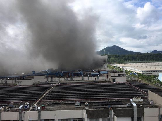 6月20日早上,深圳市坪山区龙坪路比亚迪厂区内一栋厂房的4楼起火,厂房上空黑烟滚滚,几公里外清晰可见。