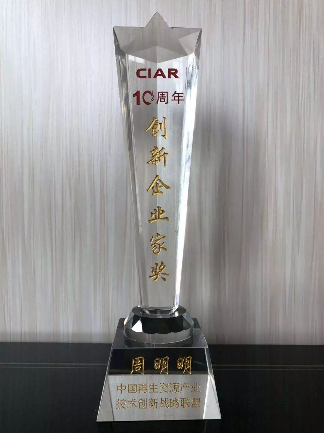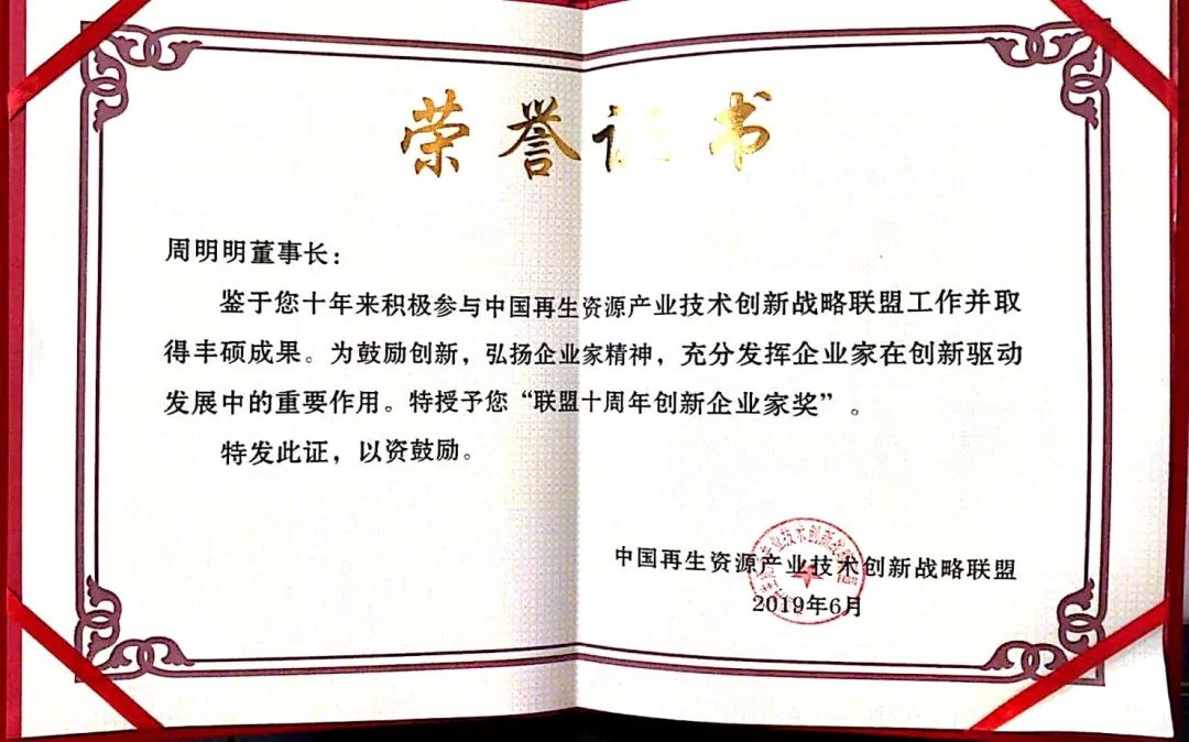 近日,2019再生资源产业创新驱动高质量发展峰会暨中国再生资源产业技术创新战略联盟成立十周年年会在北京隆重召开。会上,表彰了一批创新引领实现产业绿色发展的先进集体和个人,超威集团董事长周明明荣获获得“联盟十周年创新企业家奖”殊荣。