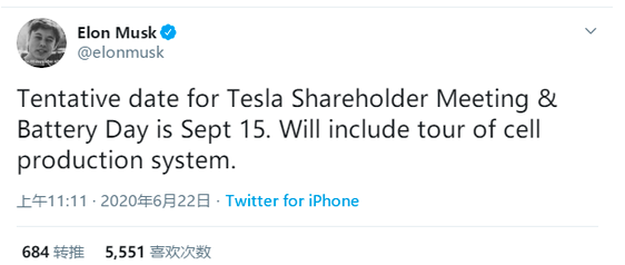 6月22日消息,特斯拉CEO埃隆·马斯克在社交媒体上宣布,暂定于9月15日召开特斯拉年度股东大会和电池日活动,活动将包含参观电池生产系统。