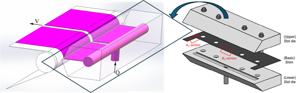 在挤压涂布系统中,涂布模头是最重要的一个组成部分。如图1所示,涂布模头一般包括上模和下模,上模和/或下模中加工出一定几何形状的腔室,上模、下模和垫片组装在一起形成涂布狭缝。浆料从进料口泵入模头内部腔室中,然后从涂布狭缝中流出,在模头唇口形成速度、流量和压力分布均匀的流体,再转移到箔材上。