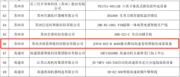 近日,2024年江苏省首台(套)重大装备名单公示,苏州杰锐思智能科技自主研发的“JCW16-H3S-B 4680激光模切高速卷绕智能化成套装备”成功入选。同时该装备也荣获2024年“苏州制造”品牌产品认证。