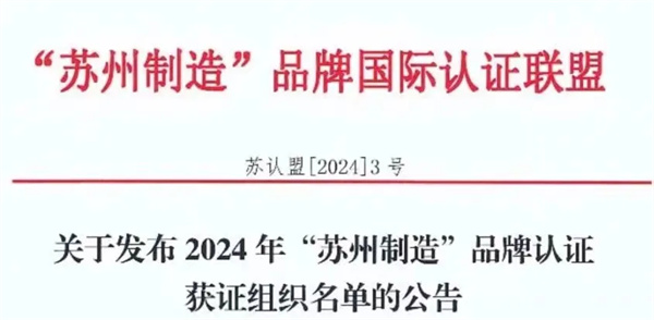 “苏州制造”品牌认证是采用国际通行的合格评定方式,依据标准进行市场化评价,具有自主创新、品质高端、信誉过硬、市场公认特性的高端质量品牌认证。