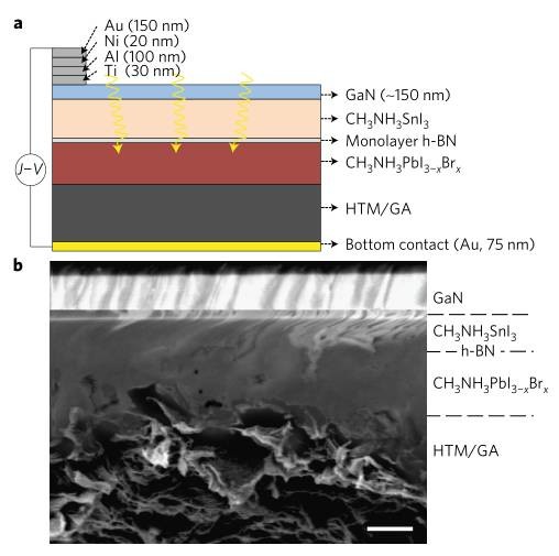 Onur Ergen等人报导了无反射涂层下稳态转换效率平均为18.4%、最高为 21.7%的梯度能隙钙钛矿太阳能电池。该电池基于两个钙钛矿层(CH3NH3SnI3和CH3NH3PbI3-xBrx)的结构,结合了GaN、单层六方氮化硼和石墨烯气凝胶。