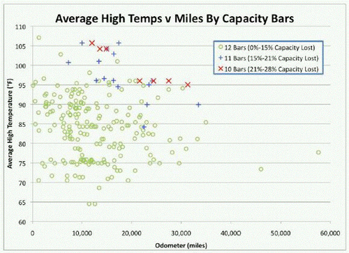 上图是美国电动汽车协会调研特斯拉Roadster的衰减数据:行驶里程越长,衰减越大;温度越高,衰减越大。