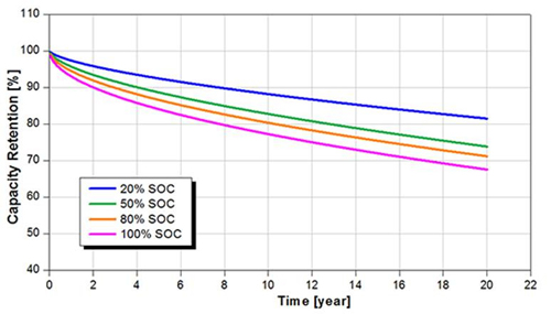 这张图展示的是电池或车辆正常存放时的衰减情况。即使车辆不运行正常存放时,电池电量也会逐渐衰减。图中的SOC是表征荷电态的参数,完全充满电为100%SOC,完全放空电为0%SOC。但要注意的是,电池不要在完全放空电时存放。