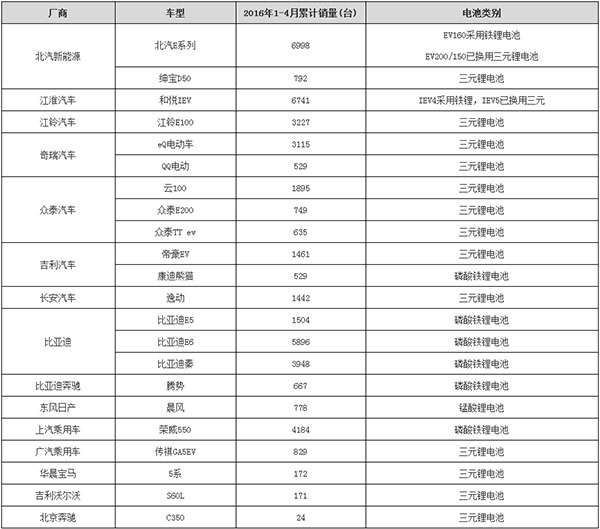 图2 2016年1-4月中国三元锂电池车型搭载量及增长