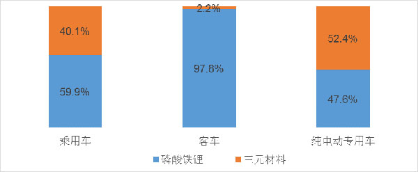 图3 2016年1-4月中国不同车型三元锂电池与磷酸铁锂电池搭载量结构