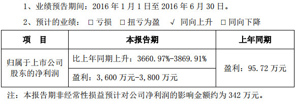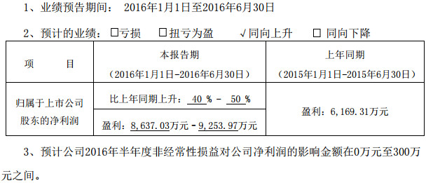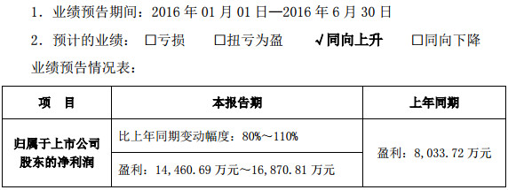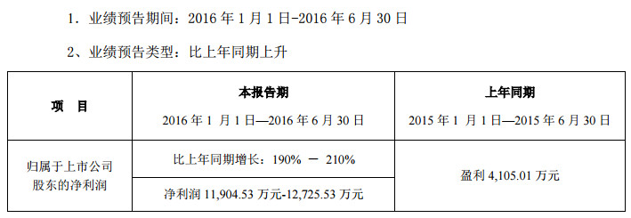 新宙邦公告,预计2016年半年度实现净利润同比增长190%-210%,盈利11,904.53万元-12,725.53万元。