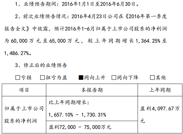沧州明珠表示,此次业绩预告修正主要是由于预计2016年1-6月公司主要产品的销量、营业收入较上年同期比原预期有所增长,导致归属于上市公司股东的净利润比原预期有所增加。