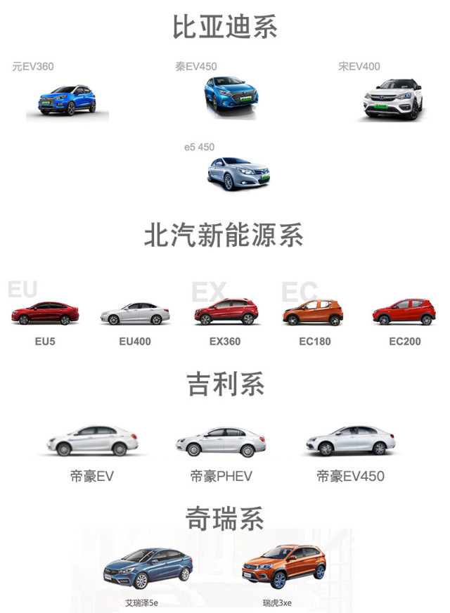除e6和插混车型外的比亚迪全系,北汽新能源全系(EC180部分车型不算)、吉利帝豪新能源、奇瑞艾瑞泽5e和瑞虎3xe等,都采用了三元锂电池作为动力电池组。