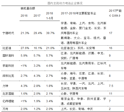 产能的高端与低端是相对的,一般根据动力电池产品品质、生产技术水平、企业综合实力、市场份额、应用领域来区分,通常也是主流车企的配套首选。高端产能的市场需求量正在提高,可从装机量说明。2017年我国前10家动力电池企业装机量总和达到26.7GWh,市场占有率为73.6%,2018年上半年增长到约85%。国内主流动力电池企业以宁德时代、比亚迪为龙头,是高端产能的集中阵营,贡献了行业内70%以上的装机需求量。其中龙头企业宁德时代、比亚迪的市场占有率由2017年的45.5%,提升到2018年上半年的60.7%。