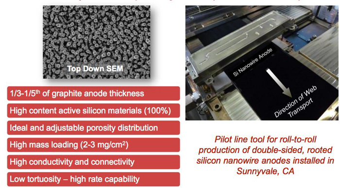 硅纳米线技术有如下特点:100%纯硅负极在不损害电池的机械稳定性情况下正常的膨胀和收缩,并且电极厚度达到石墨的1/3-1/5,高涂布loading,好的导电性和倍率性能。