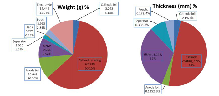 硅纳米线的容量在1200-1600mAh/g,要完成目标主要是依赖于正极材料的重量和体积比能量的提升,下面是以已经开发法完成的10Ah电池为例对比了电池各个材料在重量和体积两个指标上的影响。