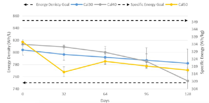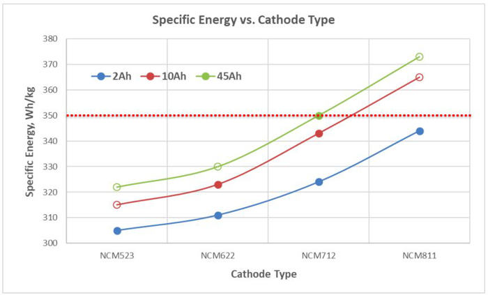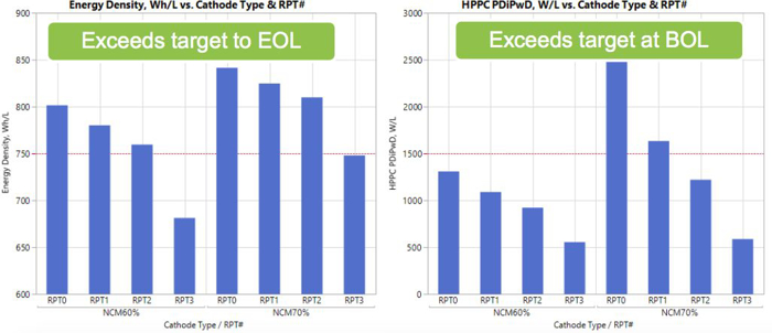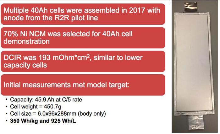 为了实现USABC的高能量密度的目标,在负极上肯定要匹配硅材料,正极也必须选择高镍三元材料来匹配电池体系,另外电解液和其他材料也选用了目前最先进的产品。刚开始是先开发硅负极和其他电池材料体系用于2Ah的小软包电池来减小目标差距。然后在进一步降低风险的情况下放大电池形状到10Ah,作为中试级别样品。最终再开发出40Ah动力电池标准产品交付量产。