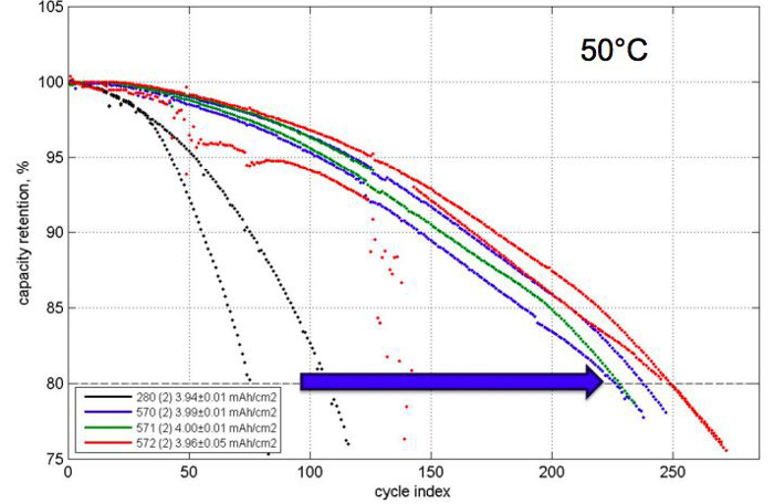 主要是通过新的电解液配方或添加剂和电芯的化成制度上做了改善,使50℃的高温循环寿命提升了150%左右。