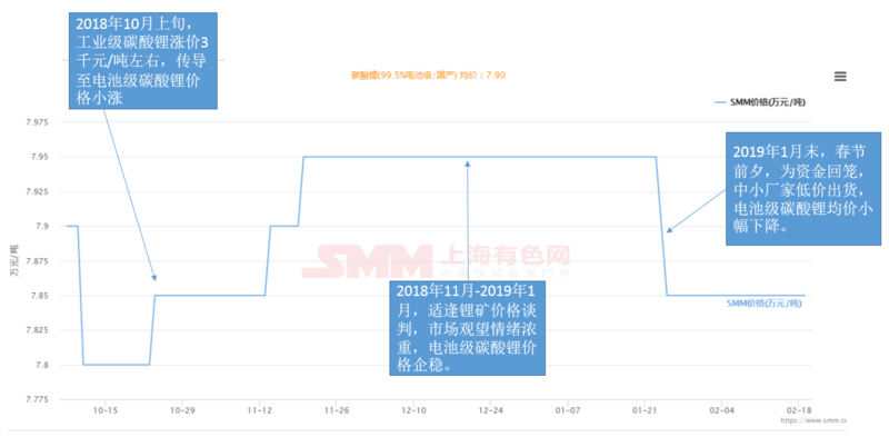2019年1月末,临近中国农历春节,部分中小锂盐厂为了资金回笼,愿意降价出售碳酸锂,而锂盐大厂坚持高价不肯让步。此时电池级碳酸锂的成交价格区间拉大,为7.6-8.1万元/吨。并自节前维持至今。