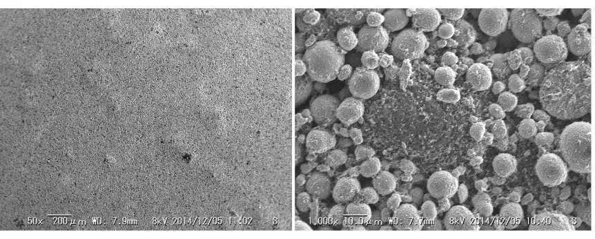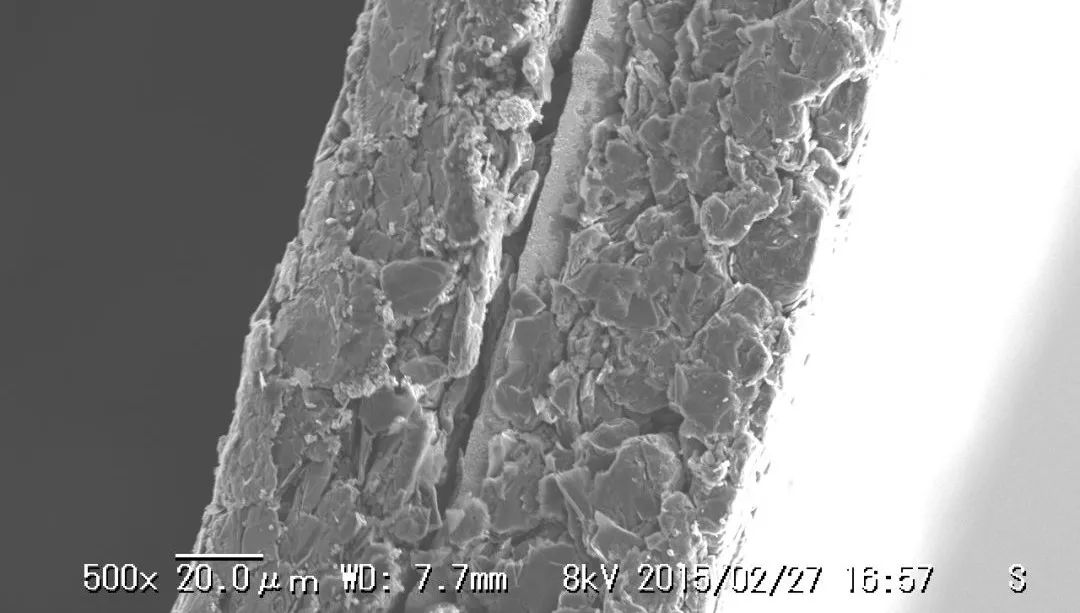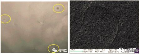 左图带有气泡的负极片、右图扫描电镜200倍放大图。在合浆、转运和涂布过程中,粉尘或长度较大的毛絮物等异物混入涂布液中或落到湿涂层表面,该处涂层表面张力因受外力影响导致分子间作用力发生改变,浆料发生轻度转移,经烘干后形成圆形痕迹,中间偏薄。