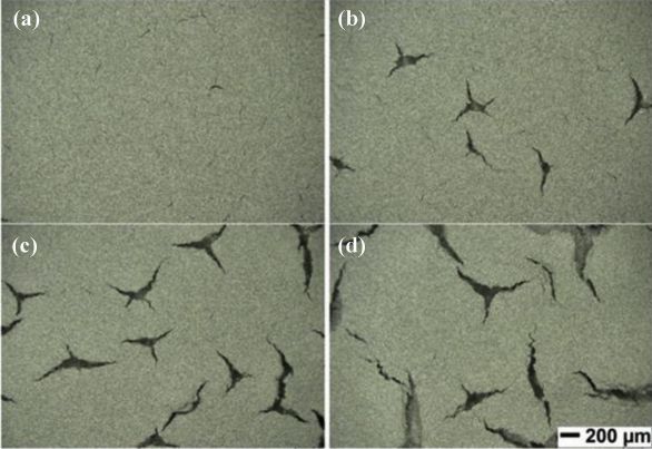 极片表面裂纹光学照片,涂布面密度分别为 (a) 15 mg/cm2,(b)17.5 mg/cm2, (c) 20 mg/cm2和(d) 25 mg/cm2,厚极片更容易出现裂纹。