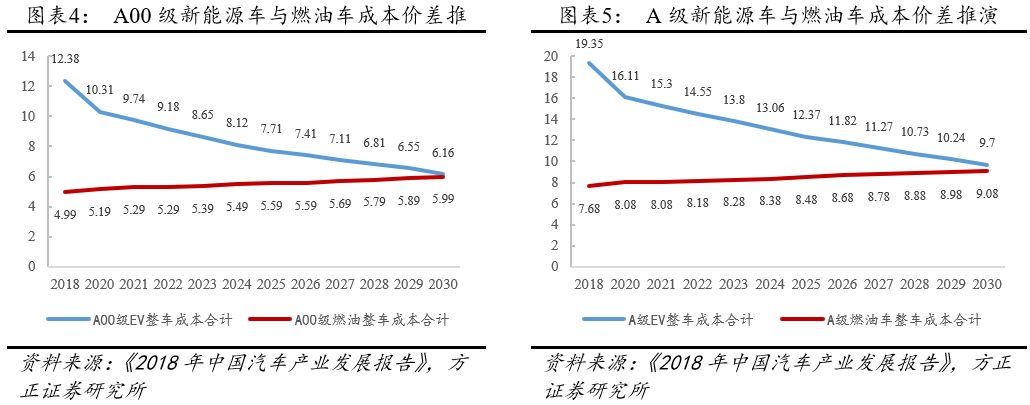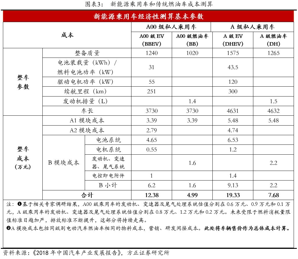 整车成本(含税金和毛利润,可视为厂商指导价格)测算方式如下:选取乘用车中占比较高的A00和A级车进行经济性分析,将动力系统不同部分定位为B模块成本;B模块之外正常物料成本,营销、研发间接成本摊销,定义为A1模块成本;尚未达到新能源汽车量产,产生的额外费用定义A2模块成本,将同级别电动汽车与燃油车进行对比。