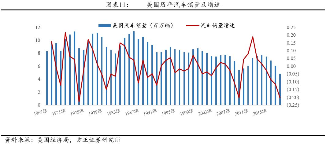 欧美汽车行业现状:已经非常成熟,可以看出明显的周期性。美国在千人保有量达到150以后,从之前的持续稳定增长转化为低速增长与高波动,波动性远大于复合增速。日韩的情况也一样。