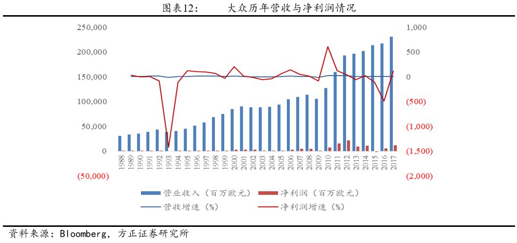 车企周期:比如福特、通用、大众等企业都呈现出明显的强周期性,历史经营波动性较大,最少5-7年就会出现大幅上升或下跌,利润会大于收入变化。下图以大众为例。