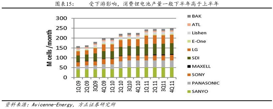 消费锂电行业:消费锂离子电池的下游主要是电脑、手机、充电宝等消费电子产品,消费者的习惯通常受到季节性的影响。在每年中的下半年,由于受到金九银十的消费习惯影响,以及双十一、双十二等促销因素,消费电子产品在产销量方面一般下半年高于上半年。因而消费锂离子电池会有类似趋势存在。