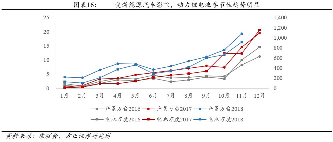 动力锂电行业:总体而言,动力电池行业受下游新能源汽车行业影响,装机量呈现季节性波动。一般来说,新能源汽车产销量在2月会受春节影响而陷入低迷,3月恢复增长态势,在四季度会有一个抢装冲量的情况。这点和传统汽车比较相似,但不同的是新能源汽车季节性波动受政策影响极大,比如2018年的过渡期在6月,4、5月出现了明显的抢装情况,导致6月负增长。