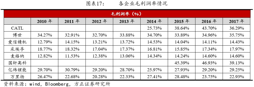 4.1.2请国内动力电池享有低成本带来的毛利率优势,但毛利率中枢将继续下行