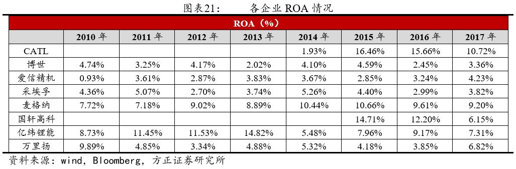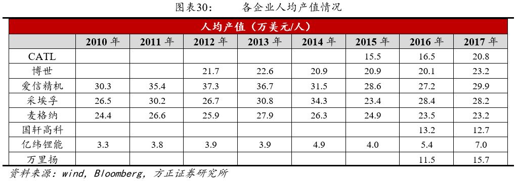 成本优势带来毛利率的差距:但我们同样发现了万里扬、爱信精机、采埃夫三个变速箱企业的毛利率的差距。万里扬毛利润率比爱信精机、采埃夫高5-9个点;由于一线企业在对下游的定价能力上强于二线企业,我们估计万里扬的毛利润率水平高于一线企业的核心原因在于成本优势。国内企业较国外企业拥有人工成本、产业配套成本等优势。我们可以据此合理推测,国内动力电池企业相较于国外同行也会因为人工成本、产业配套等成本优势,产生持续的毛利润率优势。