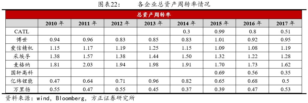 由于动力电池是对传统汽车核心零部件的替代,因此具有一定可比性。我们选取了全球传统汽车零部件巨头:博世(全球第一;汽车电子)、采埃孚(转向系统;全球三大变速箱企业之一)、爱信精机(传动系统;全球三大变速箱企业之一)、麦格纳(全球第三,世界上唯一具备整车生产能力的零部件企业;以其代工制造能力闻名)。以及国内汽车零部件企业万里扬(国内具有代表性的变速箱企业)和国内动力电池企业CATL(龙头)、国轩高科(代表第二梯队水平)、亿纬锂能(代表第二梯队水平)。并希望通过个股主要的财务指标去找寻行业间的联系,从而能够更好地去理解动力电池行业。