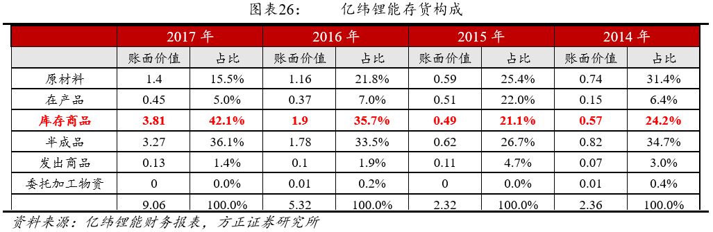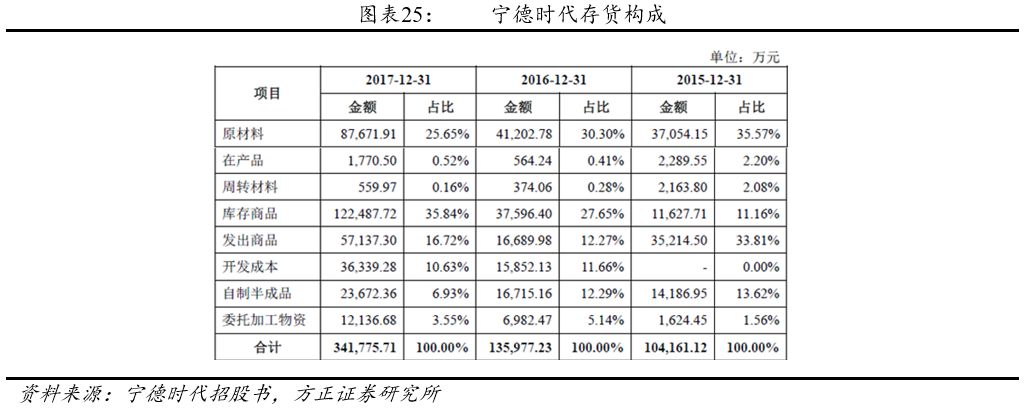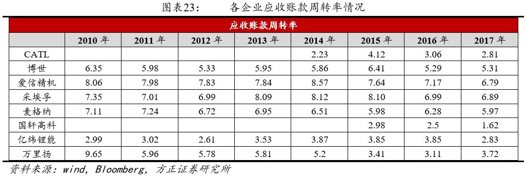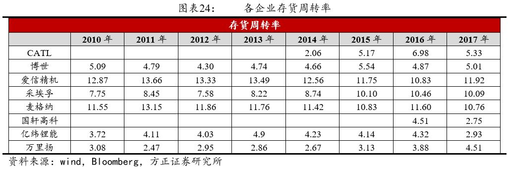 从数据上看到动力电池企业龙头宁德时代存货周转率大幅领先于二线的国轩高科与亿纬锂能,同时国际一线的变速箱企业也大幅领先于国内二线的变速箱企业万里扬。另外一方面,分析宁德时代、亿纬锂能、国轩高科,我们发现这三个企业在2015年-2017年之间库存商品占存货的比例都出现大幅增加,我们认为这与行业高速成长增速相符。因此,随着新能源汽车行业未来发展预期趋于稳定,动力电池企业存货周转率会逐步提升。