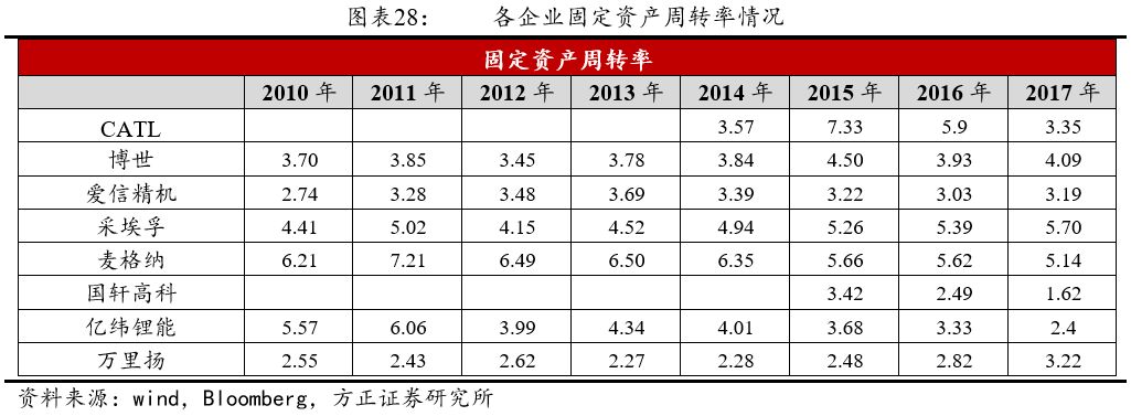 研发费用率:研发费用率投入的高低与产品更新迭代相关,博世的投入明显领先,近几年达到10%以上。这反应了博世集团对技术研发的高度重视,在汽车领域,博世提供的核心零部件有几百个之多。基本上汽车所有的核心零部件都是博世生产的,而且有很多零部件是博世首创最后成为汽车的标配。而采埃孚和爱信精机其次,最低的是麦格纳,原因和麦格纳擅长代工制造有关。动力电池目前还处于技术进步较快的时代,因此我们看到研发费用的投入处于相对较高的区域,宁德时代2017年的研发费用率达到8%以上,超过了二线动力电池厂商,也高于爱信精机和采埃孚。未来随着动力电池技术进步的趋缓,以及销售规模的扩大,我们认为龙头电池厂的研发费用率存在一定的下降空间。