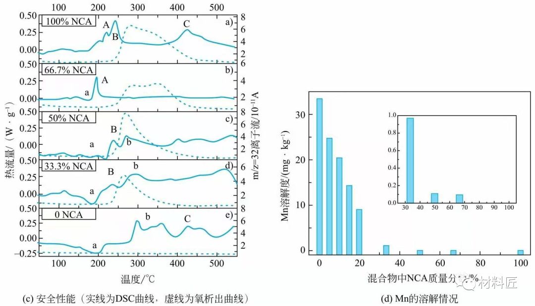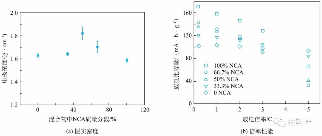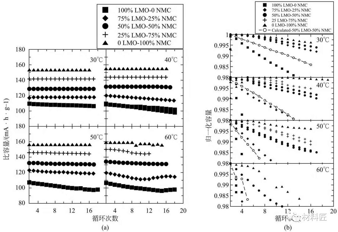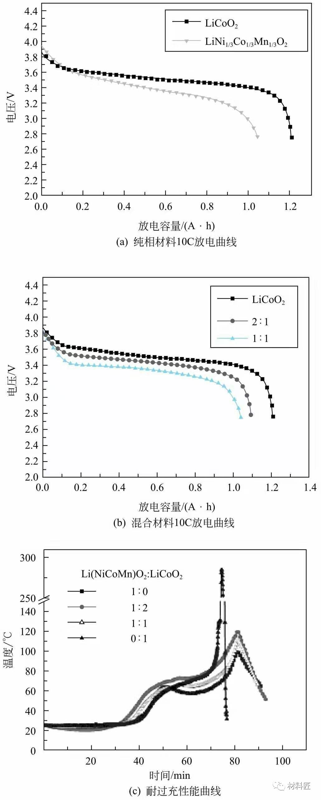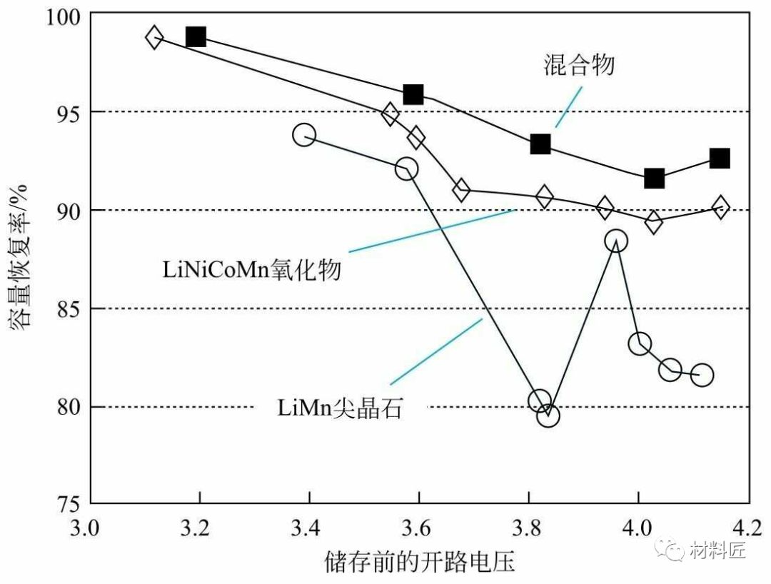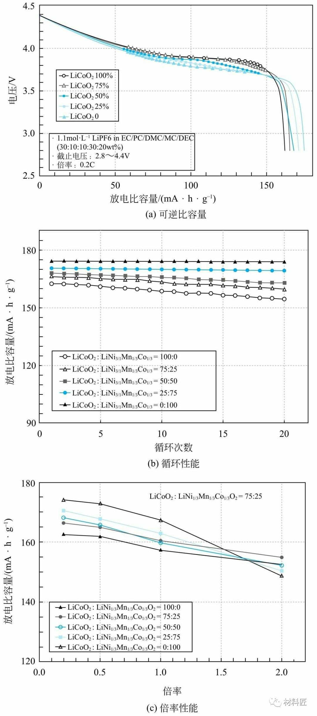 目前主流使用的正极材料主要有三元材料、尖晶石锰酸锂、磷酸铁锂等材料。这几种材料都具有各自明显的优缺点(如表1)。 表1、不同体系的锂离子电池特性 有时,人们为了为了满足不同市场的需求,利用性能互补的两种(或者以上)正极材料进行物理混合后使用,在强化单一组分材料优点的同时弥补其缺点。因为是物理机械混合,工艺简单使得混合正极材料成本较低。例如,将价格低廉、倍率性能和安全性能优异的尖晶石锰酸锂和价格较高但倍率性能和安全性能略差的三元材料混合,可以制备出价格适中、倍率性能不错的电池。 尖晶石锰酸锂和三元材料的混合 三元材料中混入尖晶石锰酸锂,不仅可以降低材料成本,还能提高正极材料的倍率性能和改善安全性能。两种材料混合制备的正极极片如图1所示。 图1 尖晶石锰酸锂和三元材料混合使用电镜图 J.R.Dahn小组研究了尖晶石锰酸锂和NCM111混合使用的情况,LiMn2O4和NCM111的混合比例(质量百分比)分别为:100%:0;75%:25%;50%:50%;25%:75%;0:100%。混合材料在不同温度下的循环性能如图2(a)所示。 图2 混合材料在不同温度下的(a)循环性能和(b)容量衰减情况 从图2(a)中可以看出,在高温下LiMn2O4的衰减很快。为了区分出各种材料的衰减情况,将上图中的容量归一化处理,结果如图2(b)所示,从图中可以看出,混合正极材料中LiMn2O4的含量越高,电池衰减越快。随着温度的升高,电池的衰减速度也越快。但是混合正极的衰减速率并不是LiMn2O4和NCM111两种材料单独衰减速率的简单加和,图2(b)还用100%的LiMn2O4电池的衰减速度和100%NCM111电池的衰减速度计算出LiMn2O4:NCM111为50%:50%的混合正极的衰减速度,发现实际测试结果比计算出的结果要好。J.R.Dahn小组研究后发现,这种现象产生原因是三元材料的加入,抑制了LiMn2O4中Mn的溶解,而Mn溶解是LiMn2O4容量衰减和库仑效率降低的主要原因,降低Mn离子的溶解可以阻止材料因颗粒表面Li富集而造成的容量衰减。 Albertus等将NCA和LiMn2O4按质量比1:1混合,对比了混合材料与单个材料在不同倍率下电压平台,如图3所示,混合正极材料在高倍率(如5C)拥有比NCA更高的电压平台,倍率性能更优。 图3 NCA和LiMn 德国的Hai Yen Tran等研究了尖晶石锰酸锂和NCA混合的正极材料性能。LiMn2O4和NCA的混合比例分别为66.7%: 33.3%,50%:50%,33.3%: 66.7%,0:100%。研究结果表明:①比例合适时,混合材料的振实密度提高,如图4(a)所示;②混合材料具有较好的倍率性能,如图4(b)所示;③混合材料的安全性能优于纯NCA,如图4(c)所示;④混合材料的Mn溶解大大减低,如图4(d)所示。 图4、尖晶石锰酸锂混合不同量NCA材料后的相关性能 H.Kitao等用LiNi0.4Mn0.3Co0.3O2和LiMn2O4的混合正极做成18650电池,测试电池在45℃下保存30天的容量恢复,发现混合正极的存储性能大为提高,如图5所示,图中所示混合正极的比例为LiMn2O4:LiNi0.4Mn0.3Co0.3O2=40%:60%。 图5 LiNi0.4Mn0.3Co0.3O2 钴酸锂和三元材料的混合 钴酸锂和三元材料的混合在业内被广泛采用,和钴酸锂相比,三元材料价格低廉,循环性能优异,容量较高,但材料加工性能、压实密度、电压平台等略低于钴酸锂,将两者按一定比例混合,不仅可以改进钴酸锂(LiCoO2)的耐过充性能,而且可以改善三元材料(NCM和NCA)的倍率性能和能量密度。 H.S.Kim等LiNi1/3Co1/3Mn1/3O2与LiCoO2按不同比例混合,并对其电化学性能进行了测试,如图6所示,随着LiNi1/3Co1/3Mn1/3O2在组分中的比例增加,电池的可逆比容量与循环稳定性得到明显的改善,但其倍率性能变差;当混合比为1:1时,倍率与循环性能最佳。 图6 LiCoO2 X.J.Liu等将LiNi1/3Co1/3Mn1/3O2与LiCoO2混合后,以10C放电,不仅放电比容量高于纯相的LiNi1/3Co1/3Mn1/3O2材料,而且电池的耐过充、安全性能更为优异,如图7所示。 图7 LiNi1/3Co1/3Mn1/3O2与LiCoO2放电比容量 J.Kim等研究了LiNi0.8Co0.1Mn0.1O2与LiCoO2混合材料的12V过充性能,LiCoO2在2C过充时,就会出现热失控,而且电池表面温度达到400℃以上;当混入40%、50%、60%(质量分数)的LiNi0.8Co0.1Mn0.1O2后,在2C过充时电池并无热失控,尤其在混入量为60%,3C过充时的电池表面温度最低(<90℃)。 C.H.Lin等将LiNi0.8Co0.17Al0.03O2与LiCoO2材料混合,当两者质量比为1:1时,20次循环后,混合材料的放电比容量仍保持初始放电比容量(161.4mA·h·g–1)的93.6%。