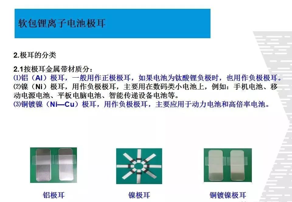 极耳,是软包锂离子电池产品的一种组件。电池分为正极和负极,极耳就是从电芯中将正负极引出来的金属导电体,通俗的说电池正负两极的耳朵是在进行充放电时的接触点。电池的正极使用铝(Al)材料,负极使用镍(Ni)材料,负极也有铜镀镍(Ni—Cu)材料,它们都是由胶片和金属带两部分复合而成。