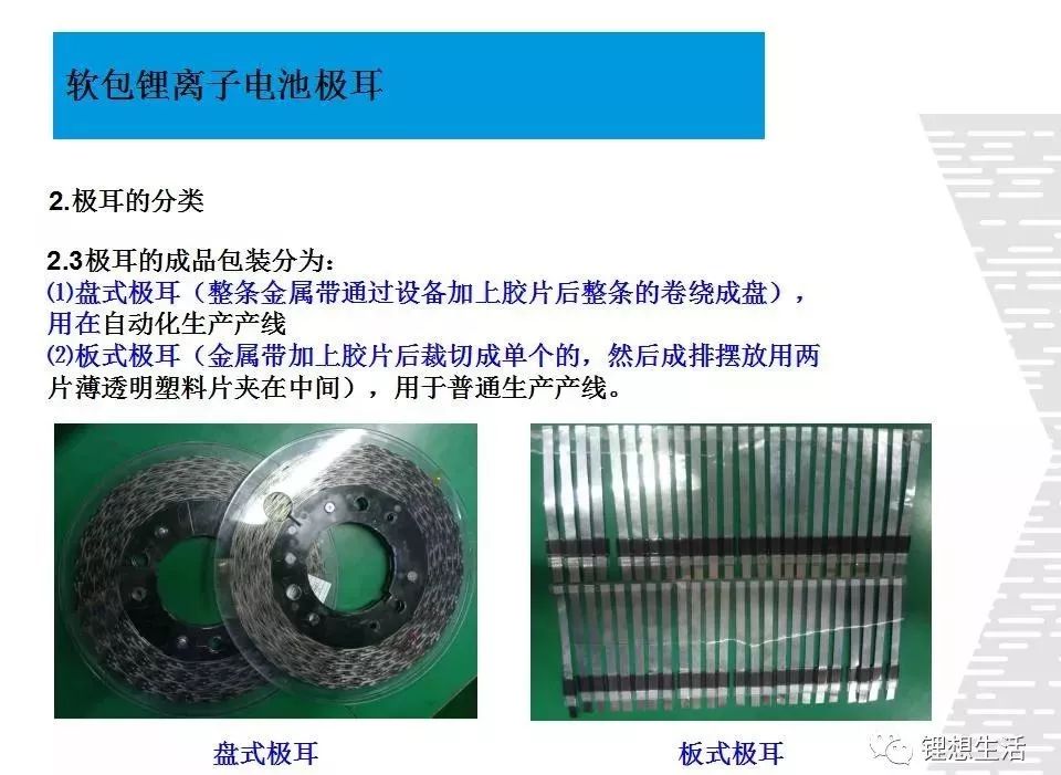 ⑴盘式极耳(整条金属带通过设备加上胶片后整条的卷绕成盘),用在自动化生产产线