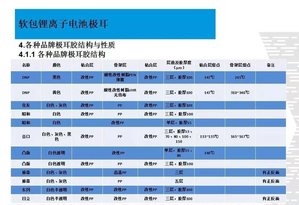 极耳胶结构:极耳胶一般由三层材料热压在一起而构成,除凸版及昭和制造单层改性PP构成及腾森制造五层极耳胶以外。一般极耳胶由中间骨架层及两表面改性PP层构成,两表面的改性PP材质相同。日立和腾森为了追求超高的粘合层与金属带的粘合强度,两个表面的改性PP材质不同,一面是亲金属性改性PP,另一个表面是亲塑性改性PP。这种极耳胶,制作极耳时一旦极耳胶表面用反了,则必定会造成电芯漏液气胀事故。